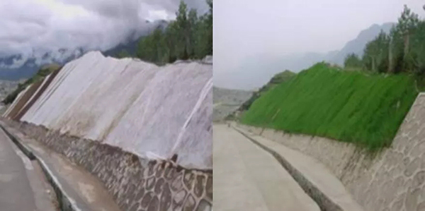 (5)覆蓋無紡布:為了保種子的發(fā)芽率,選用13g/mz的無紡布從上至下進(jìn)行鋪蓋。用竹簽或U型釘固定,注意保持搭界。無紡布的覆蓋起到保水保溫的作用并對防止發(fā)芽期雨水對坡面的沖刷。無紡布的覆蓋待苗出齊后揭除。