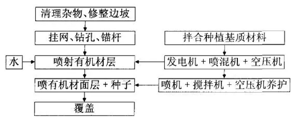 (3)噴有機(jī)材層:根據(jù)巖質(zhì)情況擬出合理的有機(jī)材配比攪拌均勻后,利用噴混機(jī)械將有機(jī)材干料加保水劑、PH緩沖劑和水?dāng)嚢杈鶆驀娚涞綆r面上。噴射均勻,噴射平均厚度要達(dá)到l0~15cm。