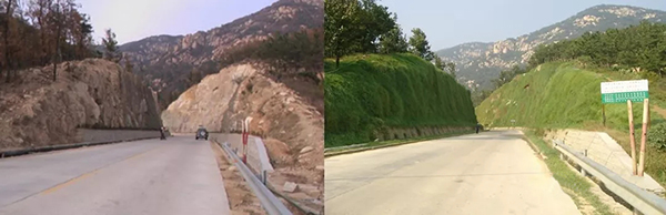 (7)治理效果:噴播完工后,種子在7~10天內(nèi)萌動(dòng)發(fā)芽,15~20天齊苗,三個(gè)月內(nèi)成坪,三個(gè)月后覆蓋率達(dá)到85%以上,水土保持初步成效,一年后灌木、藤本生長茂盛,逐步恢復(fù)自然生長狀態(tài),徹底達(dá)到水土保持,恢復(fù)生態(tài)的根本目的。