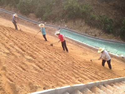 采用人工方式將種子等混合物均勻地撒播至邊坡表層。自上而下實(shí)施撒播。