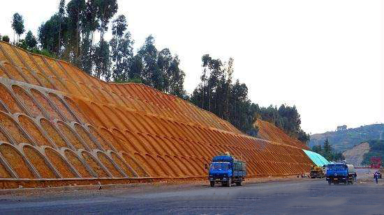 掛網(wǎng)施工時采用自上而下放卷,相鄰兩卷鐵絲網(wǎng)(土工網(wǎng))分別用綁扎鐵絲連接固定,兩網(wǎng)交接處至少要求有10cm的重疊,錨釘每平方米不少于5只。網(wǎng)與作業(yè)面保持一定間隙,并均勻一致,。較陡巖面處,可用草繩按一定間隔纏繞在網(wǎng)上,以增加附著力,使客土厚度得到保證。掛網(wǎng)可以使客土基質(zhì)在巖石表面形成一個持久的整體板塊。